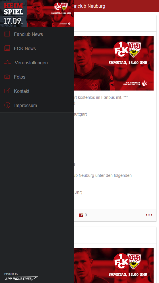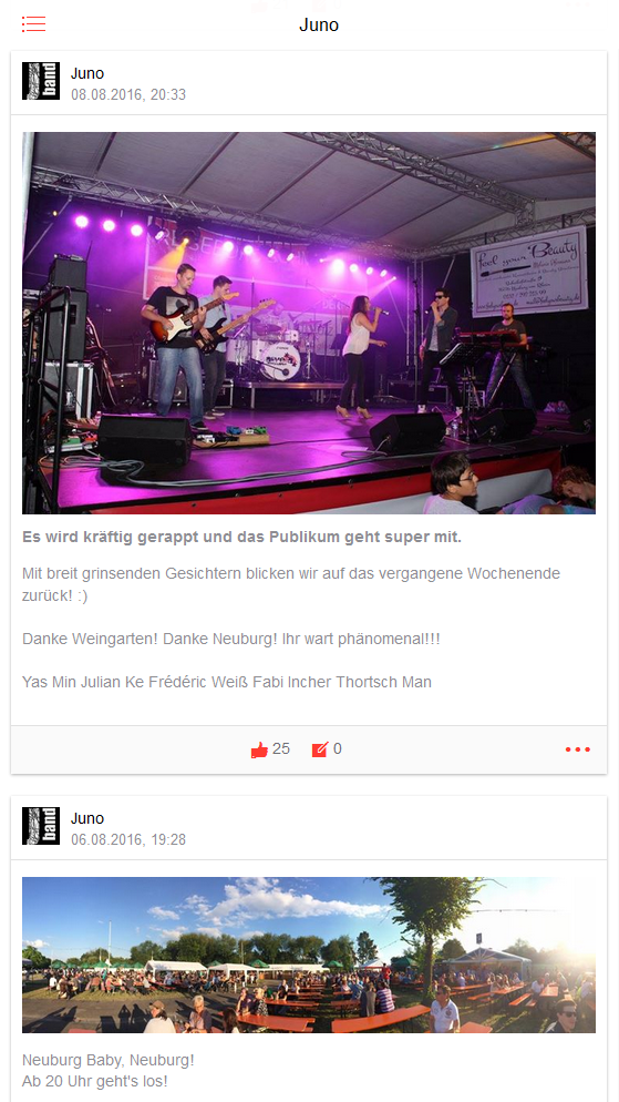 Die App "Juno" ist eine Facebook-Seiten-App, die das Template verwendet. Als Menüpunkte sind "News", "Veranstaltungen", "Fotos", "Videos", "Kontakt" und "Impressum" aktiv. Die Navigationsleiste und der Inhalt haben das weiße Layout, das seitliche Menü das schwarze Layout. In allen drei Bereichen kommt als Akzentfarbe Rot zum Einsatz.