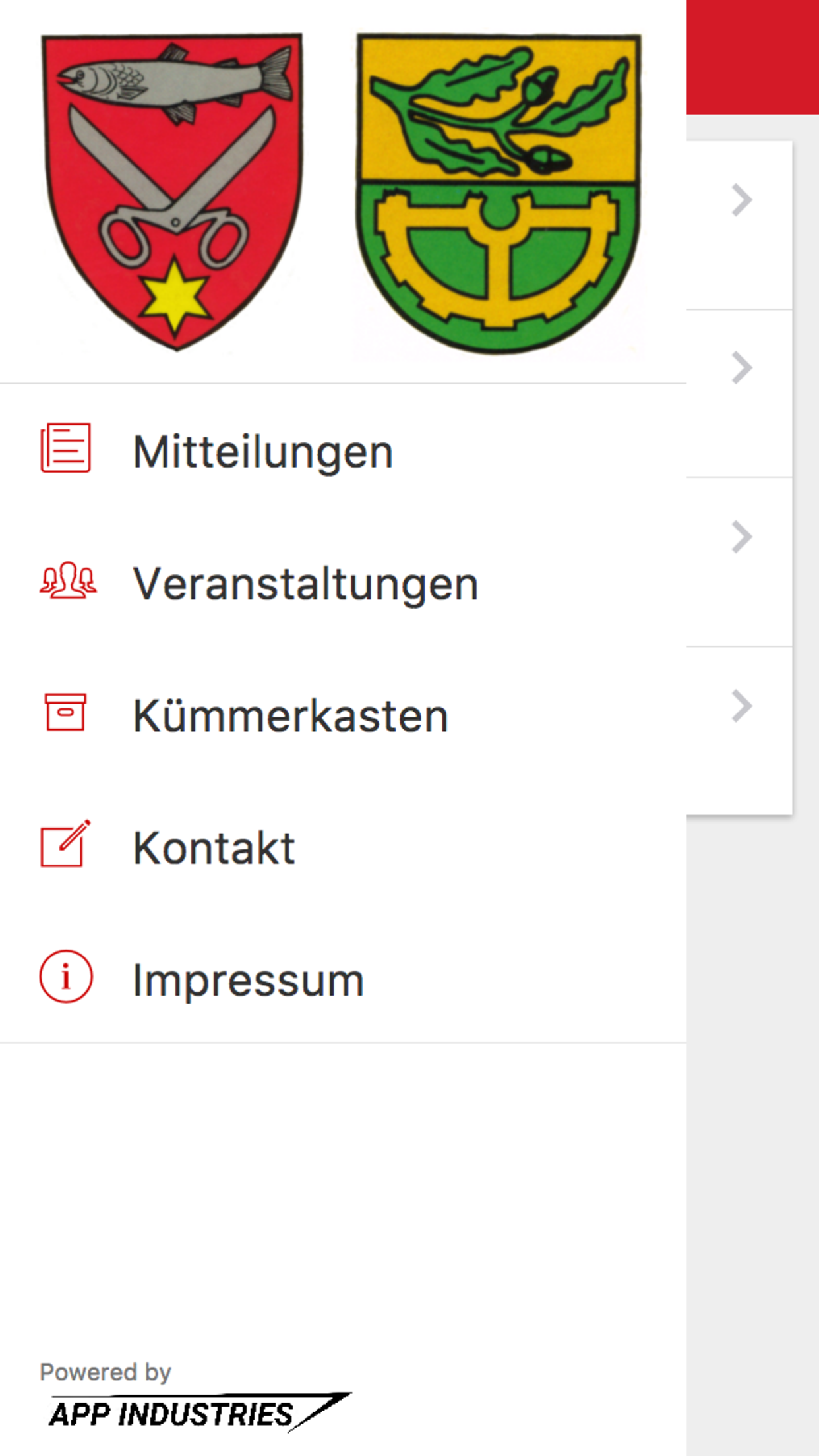 Die App basiert auf der Facebook-Seite der Gemeinde und verwendet das Template. Es gibt Menüpunkte zu "Neuigkeiten", "Veranstaltungen", "Fotos", "Videos", "Kontakt" und "Impressum". Zusätzlich gibt es eine Seite "Mitteilungen", die Bekanntmachungen aus der Verwaltung anzeigen, die unabhängig von Facebook im App Dashboard erstellt wurden. Die Navigationsleiste hat das Gold des Wappens, das seitliche Menü das dunkle Layout und der Inhalt das weiße Layout. In allen drei Bereichen kommt als Akzentfarbe Rot zum Einsatz.